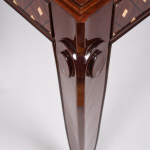 As shown: Book matched mahogany veneer and solid mahogany legs with hand carved detailing and cast brass sabots. Ebonized maple lines and brass diamond inlays set into vivid mahogany parquetry. Detachable legs for easy transport.