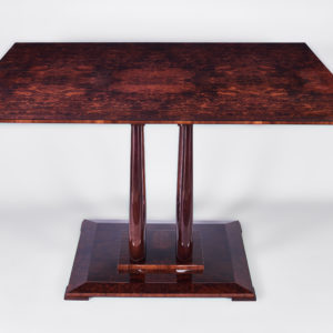 As shown: A three part dining table by ILIAD Design. Burl walnut veneer and ebony lines with unique solid walnut “u” shaped legs. Table can be re-configured from a single, large piece into three separate, smaller tables.