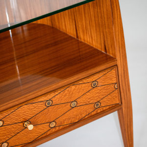 As shown: Vividly book matched rosewood veneer with single drawer in lacewood veneer with fruitwood and mother of pearl inlays. Brass pulls and originally designed sabots in a hand rubbed high gloss finish.