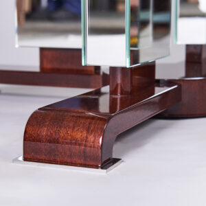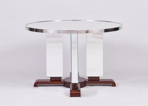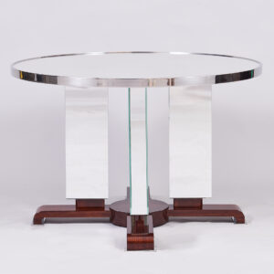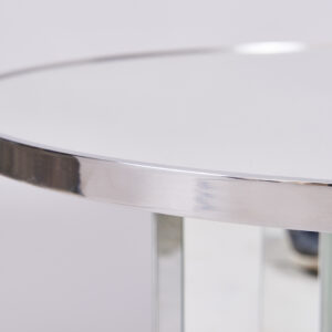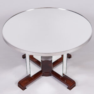 As Shown: Mirrored coffee table with a walnut base. Nickel ring around table top edge and nickel footpads.