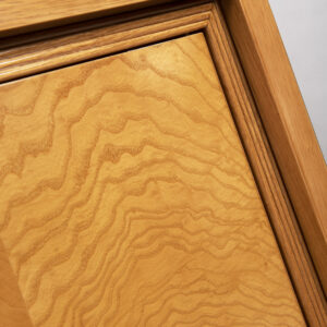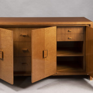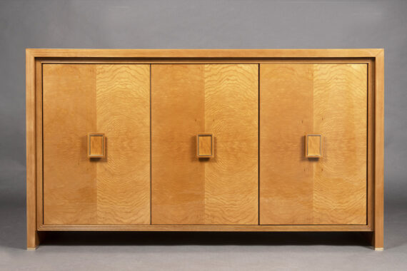As Shown: Inspired by the work of. Jean Michel Frank. Cabinet features burled Oak doors and hand crafted pulls with oak frame construction and silver leaf detailing.