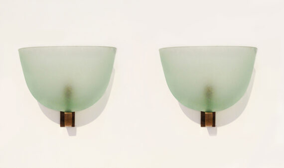 Molded green glass shades with brass mounts; stamped Venini Murano.