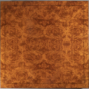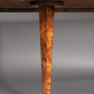 As shown: Two stand-alone 54″ square top pedestal tables with iconic trumpet style bases. Book-matched burled elm veneer with ebonized detailing in a closed pore high gloss finish. Interlocking table tops assemble to support a 54″ third drop-in leaf with attaching pedestal support. Reinforced internal steel armature with engineered steel slides. Fully extends to 162″.