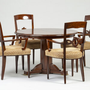 Solid mahogany. Documented chair #3620 and table #3715. Suite includes four armchairs and four side chairs.
