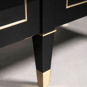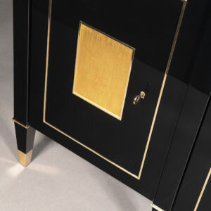 As shown: A Chic and elegant 4 door ebonized cabinet with 23 karat gilt decorative panels. Brass detailing and sabots with sycamore interior and adjustable shelves in a high gloss hand rubbed finish.