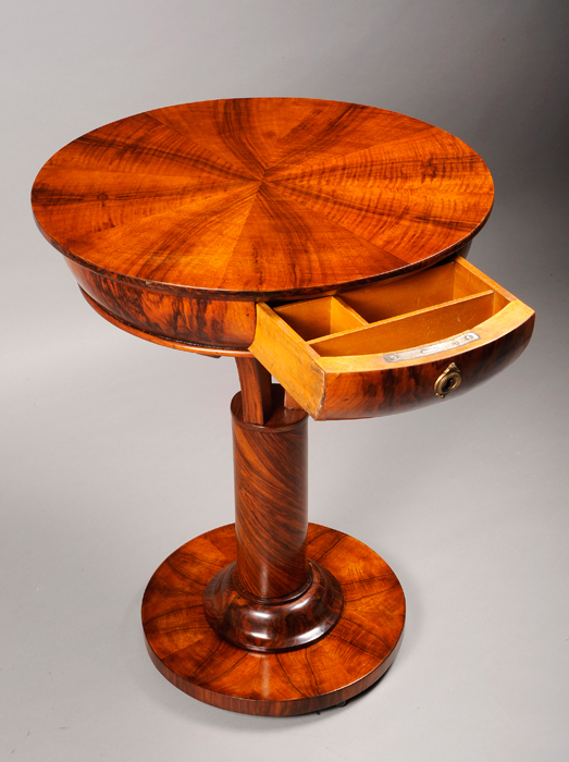 Bookmatched walnut veneer with one drawer table top supported by single column and arched volutes on tiered circular base.. Austria c. 1820
