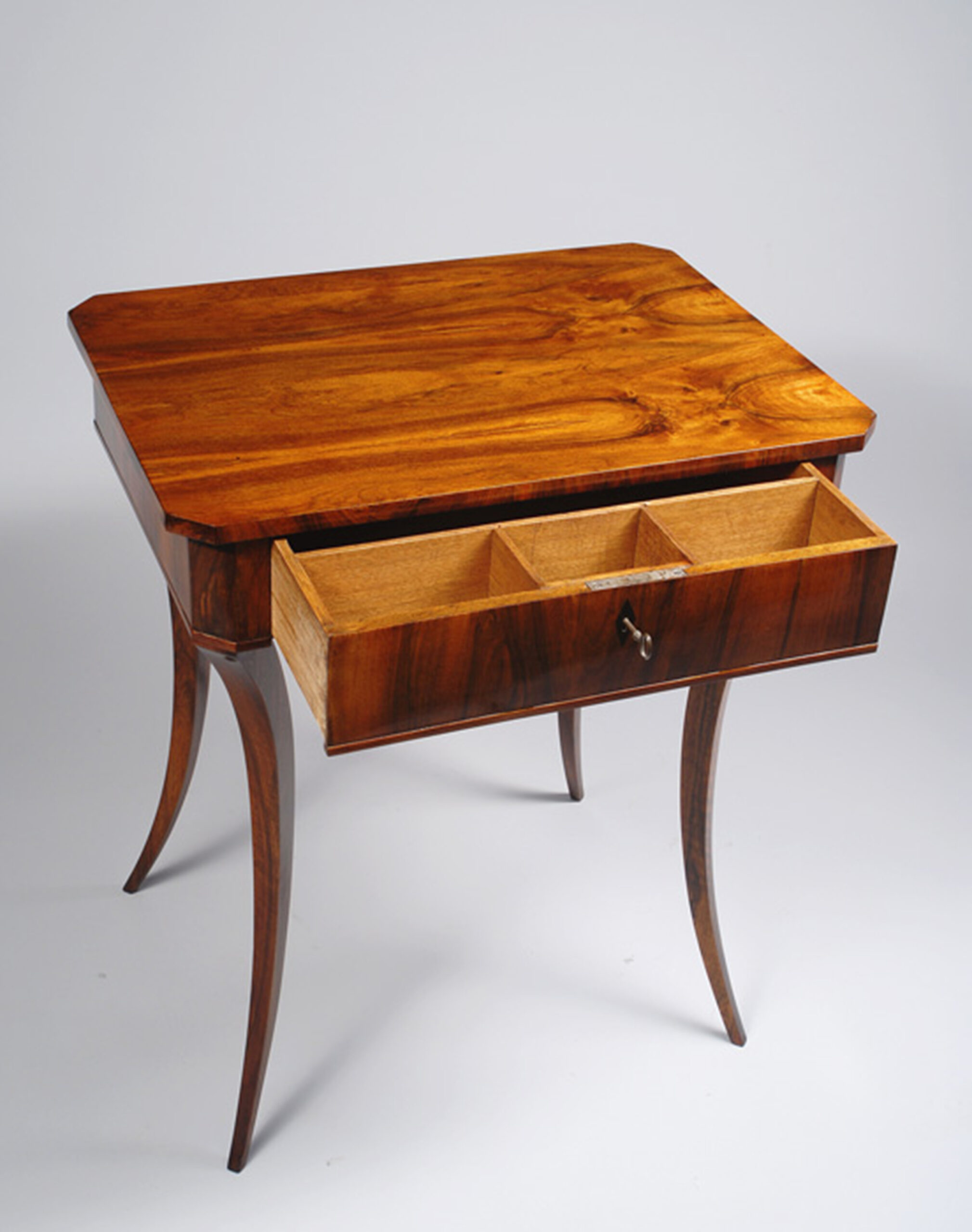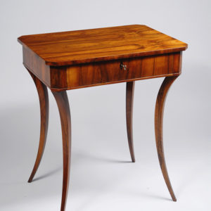 Book-matched walnut veneer with sweeping sabre leg and ebonized escutcheon