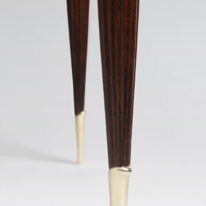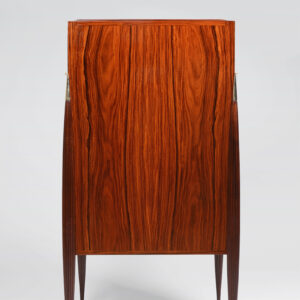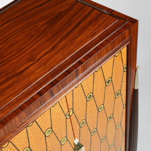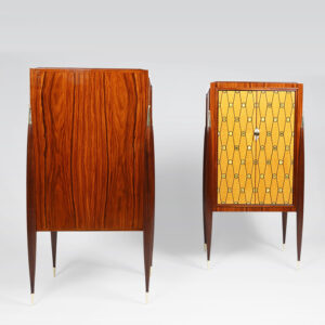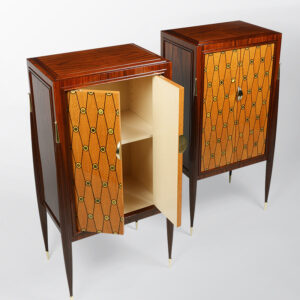 As shown: Petite matching cabinets exceptionally crafted in book matched rosewood veneer with beaded trims. Exotic lacewood veneer doors with mother of pearl and fruitwood inlays with carved, fluted, tapering legs detailed with custom brass mounts and sabots. Sycamore interior with adjustable shelving. Part of the Central Park West Collection.