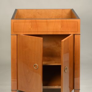 As shown: A Biedermeier style cherry wood vanity with mahogany inlays and custom brass hardward designed for drop in vitreous sink. Combination shellac and high gloss hand rubbed poly finish.
