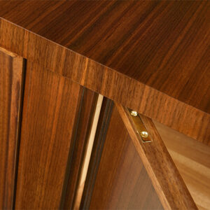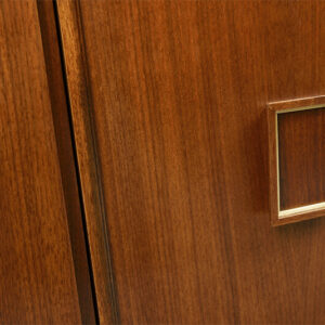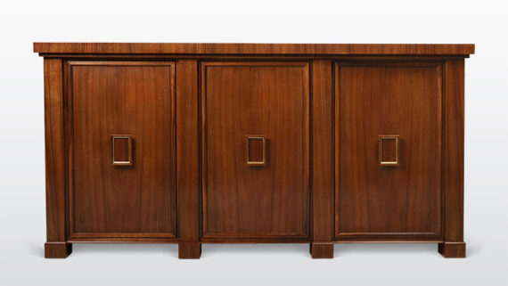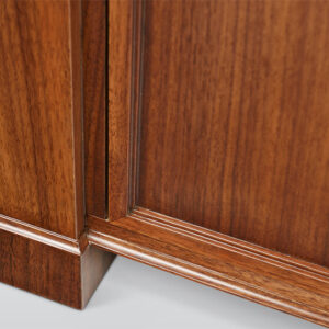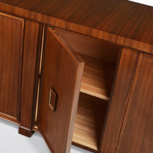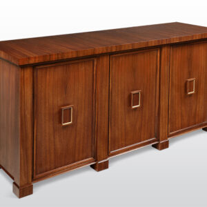As shown: A handsome three door cabinet in walnut veneer with brass detailing. High gloss hand rubbed poly finish. Part of the Robert AM Stern Interiors Collection.